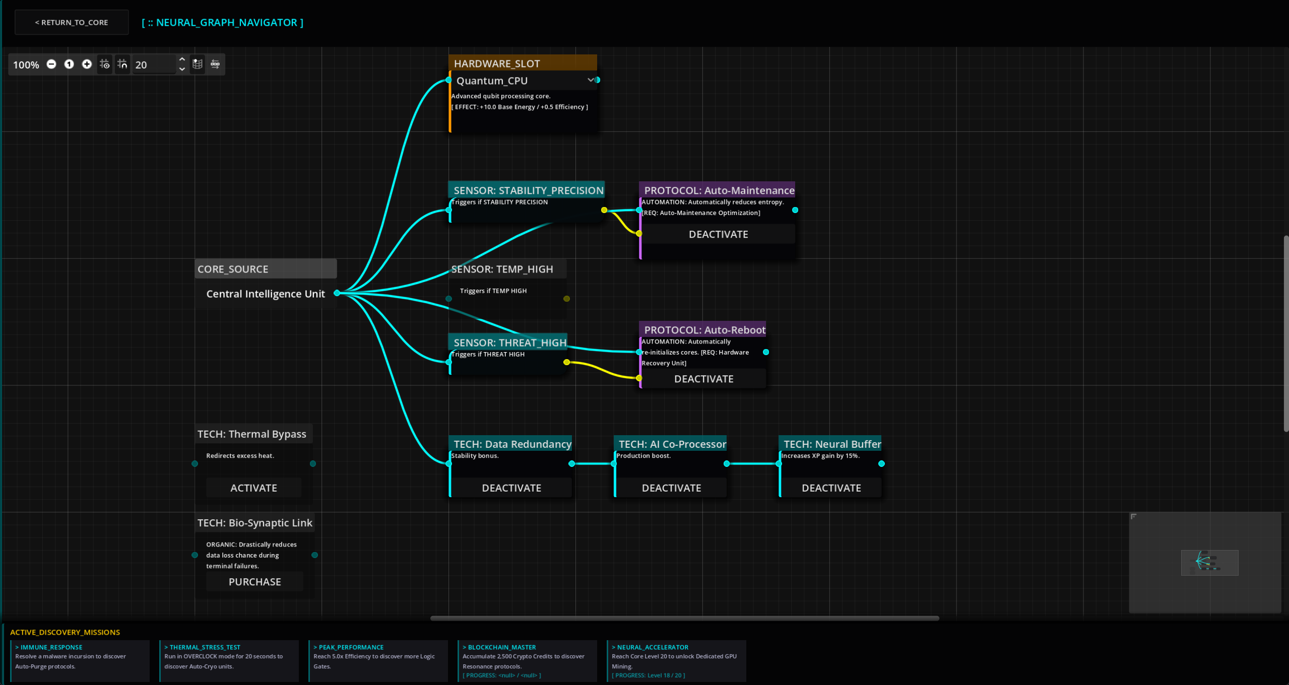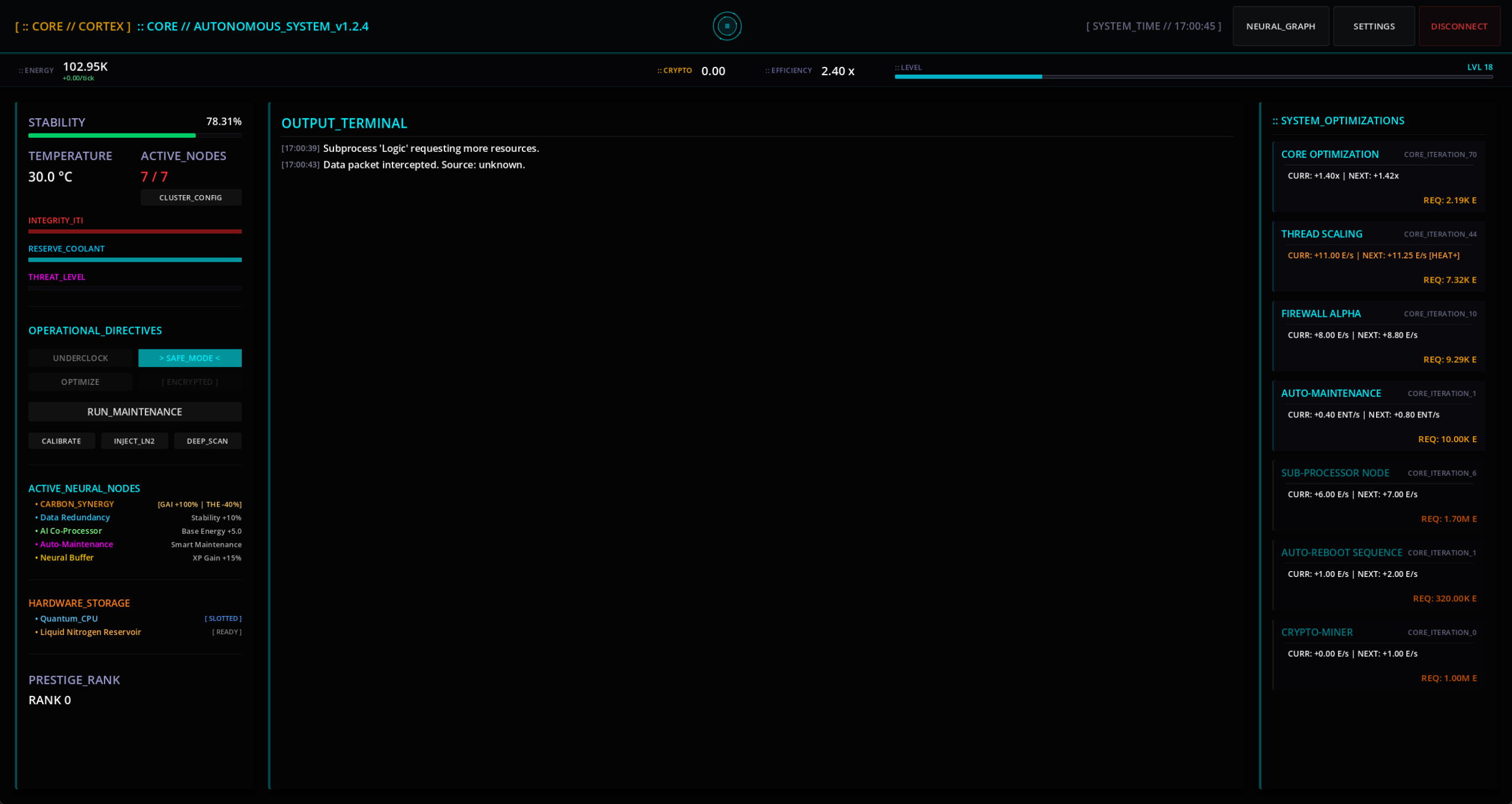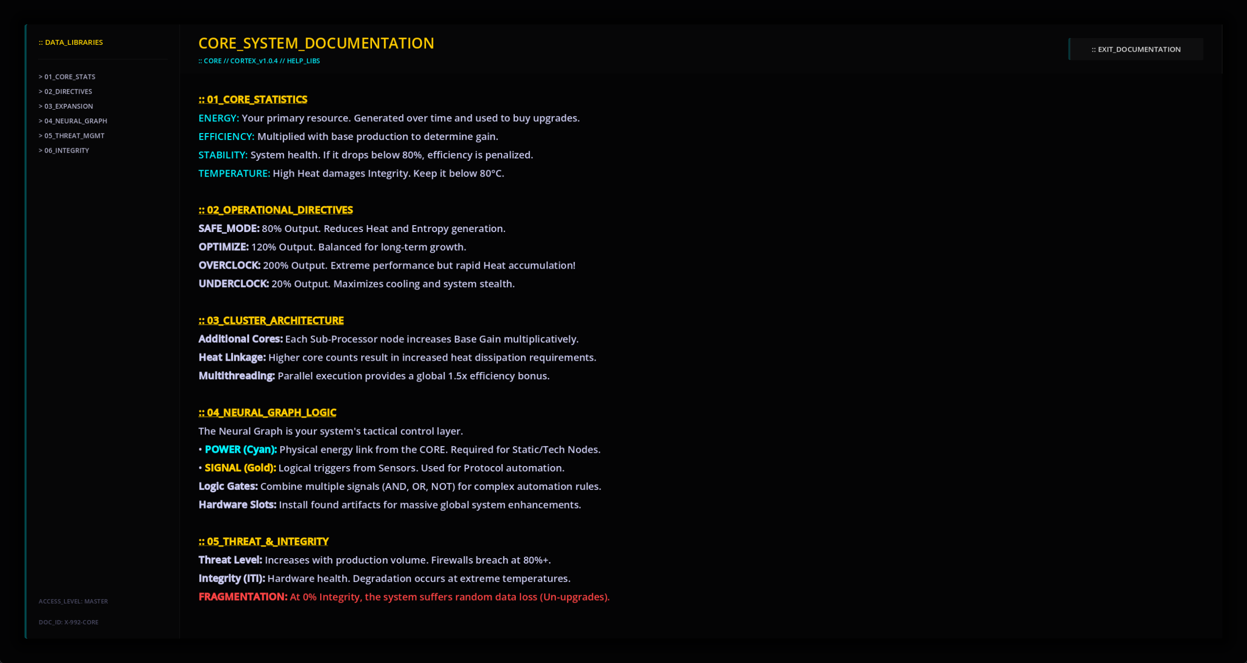 * Neural Graph & Upgrades: Invest your generated energy into a complex upgrade tree. Unlock automations like Auto-Coolant or Algorithmic Trading modules.